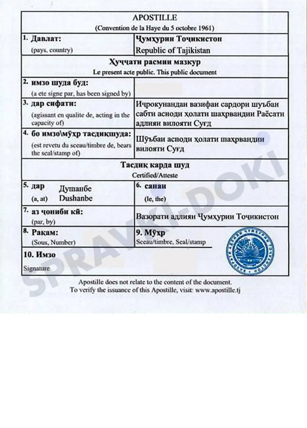 Апостиль на документы из Таджикистана