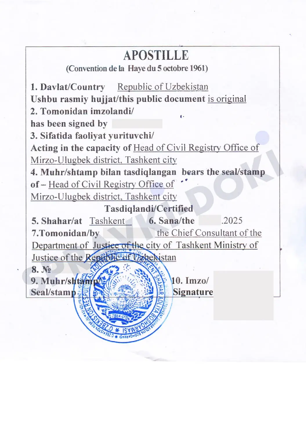 Апостиль — это специальный международный штамп, который подтверждает подлинность официальных документов. Его можно назвать своеобразной «меткой доверия»: он удостоверяет, что подпись, печать или штамп на бумаге действительно исходят от государственного органа или нотариуса Узбекистана. После проставления этой отметки документы становятся юридически признанными за рубежом, но только в тех странах, которые поддерживают Гаагскую конвенцию 1961 года.